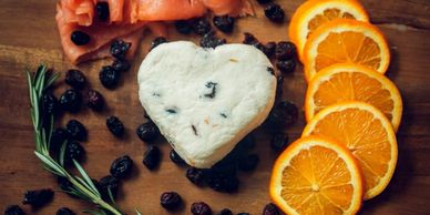 5 ounce heart shaped fresh goat cheese blended with cranberries and orange. American Cheese Society 3rd place winner 2009. This one is so good we have it year round! Use this to spread on bagels, muffins, in beet salads, fruit pizzas, or to complement chicken or pork.