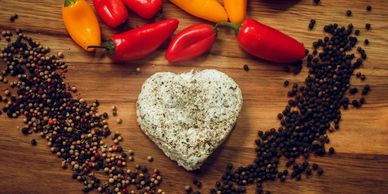 5 ounce heart shaped fresh goat cheese seasoned with fresh cracked organic peppercorns. 2009 World Cheese Award Gold winner. Our favorite way to serve it is in salads or egg dishes or just snacking with crackers.